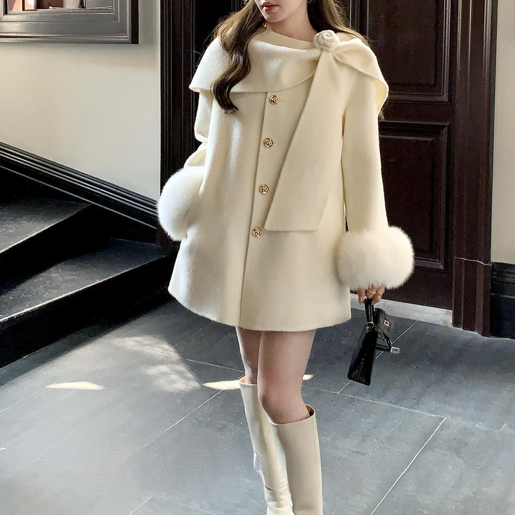 Ivory Bow-Collar Wool Coat with Fur Cuffs
